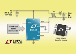 Le LT3512 fonctionne en mode Boundary qui est un contrôle en mode intensité, à découpage, permettant une régulation meilleure que 5%, sur les gammes de la tension d’entrée, des courants dans la charge et de températures. Le fonctionnement en mode Boundary, également connu sous l’appellation mode en conduction critique, permet l’emploi d’un transformateur plus petit que ceux employés dans les applications à mode conduction continue équivalentes. La tension de sortie est facilement fixée à l’aide de deux résistances externes et du rapport de transformation du transformateur. Plusieurs transformateurs, mentionnés dans la fiche de caractéristiques, peuvent être utilisés dans de nombreuses applications. Le haut degré d’intégration conduit à un produit d’utilisation simple et propre, hautement régulé, répondant aux problèmes traditionnels des alimentations isolées.
