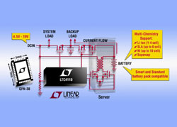 un gestionnaire de charge et de décharge de batterie à récupération d’énergie, en une seule puce, de rendement élevé, autonome, pour plusieurs types de batteries, destiné aux serveurs, à la sauvegarde de mémoires, aux équipements médicaux et aux applications à équipements de grande précision. Le LTC4110 possède quatre modes de fonctionnement : pour batterie de sauvegarde, charge de batterie, calibrage « sans perte » de la batterie et arrêt. Combiner tout ceci dans un seul circuit intégré permet d’économiser une surface de carte significative par rapport aux solutions existantes.