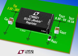 Linear Technology Corporation présente le LTM8021, un régulateur µModuleTM DC/DC complet pour système à nœud d’alimentation (POL : Point of load), avec inductance et les composants de puissance intégrés sur la carte, dans un boîtier qui ressemble à un circuit intégré pour montage en surface. Le LTM8021 fonctionne à partir d’une gamme de tensions d’entrée de 3 V à 36 V (40 V max.) et délivre jusqu’à 500 mA. La petite empreinte du LTM8021 (6,25 mm x 11,25 mm), le faible profil (2,8 mm) et le petit poids (0,49 g) permettent aux concepteurs de systèmes de souder le composant sur la face inférieure de la carte, ce qui libère de la place sur la face supérieure de la carte pour les circuits intégrés numériques comme les FPGA, les mémoires et composants passifs incluant les connecteurs HDMI, Ethernet ou SMA.