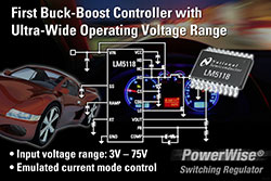 National Semiconductor Corp. (NYSE : NSM) présente aujourd’hui le premier contrôleur régulateur buck-boost continu-continu du marché avec une gamme de tension d’entrée sans équivalent sur le marché, de 3V à 75V, pour l’automobile, les télécommunications et les systèmes fonctionnant sur batterie. Le LM5118 offre une fréquence de commutation programmable jusqu’à 500 KHz, un courant de repos très faible et une transition progressive entre modes buck (abaisseur) et buck-boost (abaisseur- élévateur). Le régulateur à découpage LM5118 assure un rendement maximum de 95%, ce qui le place dans la famille PowerWise® de produits à rendement optimisé de National.