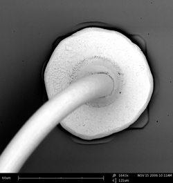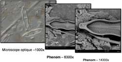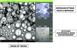Le capteur optique du Phenom permet de constituer une image globale de l’échantillon pour repérer la zone à observer et de la conserver à l’écran en permanence. La fonction microscopie électronique va ensuite agrandir la zone sélectionnée jusqu’à des échelles de l’ordre du nanomètre.