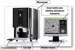 Les images haute résolution des échantillons s’affichent à l’écran avec des points de référencement clairs grâce à la double technologie optique/électronique. L’écran tactile permet une navigation facile et intuitive. Les images pourront être sauvegardées par la clé USB ou exportées par réseau Ethernet. La résolution des images va de 456 x 456 à 2048 x 2048 pixels et trois formats sont possibles : JPG, TIFF et BMP.