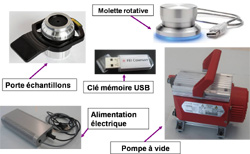 Microscope Optique (Nav Cam) : 20x Microscope électronique : 120 - 20 000x Résolution : 30 nm Générateur d’électrons : Source thermo-ionique longue vie (environ 1000 heures) Tension d’accélération : 5 kV Sauvegarde des données : clé USB 2.0, réseau éthernet Temps d’obtention de l’image électronique : < 30 s Formats images : JPEG, TIFF et BMP Taille échantillons : 25mm (diamètre) X 30 mm (hauteur ) Poids : 52 kg Servitude : courant électrique = deux prises