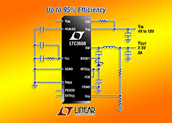 Le LTC3608 utilise des transistors commutateurs internes, à résistances RDS(0N) de seulement 10 mohms et 8 mohms, pour un rendement pouvant atteindre 95%. Le LTC3608 peut être configuré en mode de fonctionnement discontinu ou continu forcé. Le mode continu forcé réduit le niveau de bruit et les interférences RF, tandis que le mode discontinu permet d’avoir un rendement élevé en réduisant les pertes aux faibles charges, avec un courant de repos de seulement 900 µA. Le courant d’arrêt est de seulement 15 µA. Les autres caractéristiques incluent un gestionnaire de tension de sortie à drapeau « alimentation correcte », un réglage de la limitation du courant, une protection contre les surtensions en sortie et un démarrage progressif programmable.