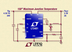 Le LTC3481 est un régulateur à découpage de 34 V (36 V max .), abaisseur, fonctionnant en Burst Modeâ qui maintient le courant de repos à moins de 50 µA. La version classe H fonctionne avec une température de jonction pouvant atteindre 150°C, alors que les versions classes E et I ont une température de jonction maximum de 125°C. Toutes les spécifications électriques sont identiques pour les versions classes E, I et H. Les composants de classe H sont testés et garantis pour une température de jonction maximum de 150°C. Ils sont idéals pour les applications de l’automobile, industrielles et en environnement sévère qui sont exposées à de fortes températures ambiantes. Le LT3481 fonctionne avec une tension d’entrée comprise entre 3,3 V et 34 V (36 V max.), ce qui le rend idéal dans les conditions de démarrage à froid et de rupture de charge rencontrées dans les applications de l’automobile. Son commutateur interne de 3,2 A peut fournir un courant continu de sortie pouvant atteindre 2 A sous des tensions aussi basses que 1,25 V. Son courant de repos de 50 µA est idéal pour les applications devant fonctionner de façon permanente comme les systèmes de sécurité de l’automobile qui nécessitent une grande durée de vie de la batterie. Le LT3481HDD est disponible, sur stock, dans un boîtier DFN de 10 broches, 3 mm x 3 mm, alors que le LT3481HMSE est disponible en boîtier MSOP-10 à performances thermiques renforcées.