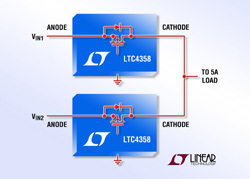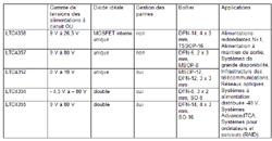 un contrôleur simple, côté chaud, à diodes idéales, utilisant un MOSFET de 5 A, qui permet le remplacement, à moindres pertes, des circuits à diodes Schottky, dans les applications de forte intensité. Le contrôleur et le MOSFET interne canal N, à résistance de 20 mohms, réalisent la fonction d’une diode à faible tension directe. Ceci procure une solution à moins de pertes en comparaison à une diode Schottky qui, dans les applications de forte puissance, permet un rendement plus élevé et économise de la surface précieuse de carte en supprimant le besoin d’un radiateur. Le LTC4358 contrôle la tension directe du MOSFET interne pour assurer une commutation souple d’une ligne à l’autre, sans oscillation. Un circuit rapide réduit les transitoires de courant inverse lorsqu’une alimentation est défaillante ou court-circuitée. Le LTC4358 peut être vu comme une diode à trois sorties pour les applications d’usage général, ou comme des alimentations à circuit à fonction OU dans les applications nécessitant une grande fiabilité.