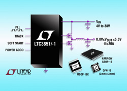 Les robustes pilotes embarqués permettent l’emploi de MOSFET externes, de forte puissance, pour fournir des intensités en sortie jusqu’à 20 A, sur une gamme de tensions de sortie de 0,8 V à 5,5 V, ce qui rend le LTC3851 idéal pour les points de distribution d’énergie. Les applications incluent les électroniques de l’automobile, de l’industrie, du domaine médical, de communication de données et des télécommunications, des imprimantes à fonctions multiples et les boîtes décodeurs pour téléviseurs ou autres. Une architecture à mode courant et à fréquence constante permet de choisir une fréquence fixe ou sélectionnée par boucle de phase (PLL), entre 250 kHz et 750 kHz.