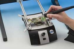 Utilisé avec ou sans le support de carte, le PCT-100 réalise des tâches de réparation ou d’assemblage manuel dans le cas de montage en surface ou d’assemblages traditionnels. Un support de carte approprié est disponible en option. Le PCT-100 convient aussi bien pour les soudures plombées que pour le sans plomb, offrant une capacité de préchauffage stable essentielle pour réaliser toute tâche d’assemblage à la température maximale appropriée sans déformer la carte.