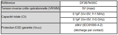 Notes : [1] ESD = Décharge électrostatique [2] Diodes de protection ESD type semiconducteur à jonction PN, couvrant la plage de fréquences allant de 4 à 12 GHz. Des travaux de recherche ont été réalisés par Toshiba Corporation en juillet 2013. [3] DF2B6.8M2SC [4] Atténuation du signal radio puissance entre entrée et sortie. La perte d’insertion du DF2B7M3SC est inférieure à 0.1 dB @ f = 5 GHz.