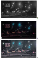 Figure 2 : Scène de trafic urbain nocturne. L’image luminosité (a) et l’image RVB couleur (b) sont combinées pour former une image composite (c)