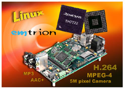 Le SH7722 est une solution SoC monopuce à haute intégration assurant les traitements audio, vidéo et voix, ainsi que l’accélération d’interfaces utilisateur graphiques sophistiquées. Le SH7722 intègre le CPU SH4AL-DSP de 600 MIPS à 333 MHz. Le composant offre diverses fonctions périphériques adaptées aux applications multimédia, dont un moteur MPEG-4 / H.264 capable d’encodage / décodage d’images vidéo H.264 de taille VGA à 30 fps (trames par seconde), un accélérateur matériel encodeur /décodeur JPEG, un accélérateur graphique 2D, un contrôleur LCD, une interface caméra 5 Mpixel et une entrée/sortie son.