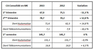 Au 2ème trimestre 2013, ACTIA Group a réalisé un chiffre d’affaires de 78,7 M€, en hausse de 12,0 % par rapport au 2ème trimestre 2012. Cette bonne performance trimestrielle est portée par la branche Automotive qui renoue avec la croissance.