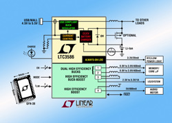 Le LTC3586 intègre un contrôle PowerPathTM à découpage, un chargeur de batterie autonome, un régulateur LDO toujours en service et quatre régulateurs à découpage, synchrones, de rendement élevé : un régulateur abaisseur-élévateur, un régulateur élévateur et deux régulateurs abaisseurs, tout cela en un boîtier compact QFN, 4 mm x 6 mm, de faible profil.