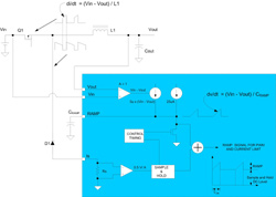 Le rapport cyclique est déterminé à la fois par l’erreur de tension de sortie et le signal en dent de scie, générés à partir du courant primaire d’inducteur par la résistance de détection de courant externe. La limitation de courant cycle-à-cycle se fait comparant le signal de détection de courant à une tension de référence interne. Le problème d’instabilité inhérente dû aux harmoniques sur les facteurs d’utilisation de plus de 50% peut être évité grâce à une compensation interne du signal rampe de courant.
