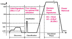 Séquence de mise sous tension La séquence de mise sous tension doit respecter scrupuleusement un schéma bien spécifique. Le PSE (appareil alimentant) détecte la connexion du PD (appareil alimenté) en mesurant l’impédance du câble (signature). Si l’impédance est entre 23.75 kΩ et 26.25 kΩ, le PSE considère qu’un PD (appareil alimenté) est présent.