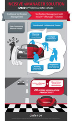 En tant qu’élément de la plate-forme de vérification fonctionnelle Cadence®Incisive, la solution Incisive vManager utilise une technologie de base de données SQL et assure un haut niveau d’évolutivité, depuis les projets de propriété intellectuelle(IP) les plus modestes jusqu’aux systèmes sur puce (SoC) de très grande envergure. En outre, pour doter les développeurs de systèmes sur puce d’une méthodologie cohérente leur permettant d’améliorer la qualité de leurs projets, cette nouvelle solution prend en charge plusieurs extensions de la méthodologie MDVet englobe des applications telles que l’accélération matérielle (émulation), la basse consommation et la simulation mixte analogique-numérique.