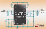 Mode courant, synchrone, qui fournit un courant continu de sortie jusqu’à 1A, à partir d’une large gamme de sources de tension, allant des batteries à un élément Li-ion aux lignes de tensions industrielles de 24V/28V et aux tensions de 40V pour l’automobile. Les gammes de tensions d’entrée, de 2,2V à 40V, et de sortie, de 2,7V à 40V du LTC3114-1 permettent d’obtenir une tension de sortie régulée, avec des tensions d’entrée supérieures, inférieures ou égales à celle de sortie, ce qui ajoute de la souplesse quant au choix de la source d’alimentation et accroît l’autonomie sur batterie dans les réalisations en mode abaisseur seulement. L’architecture propriétaire, en mode abaisseur-élévateur, à faible niveau de bruit, du LTC3114-1, offre une transition continue, sans gigue, entre les modes abaisseur et élévateur, le rendant approprié pour les applications RF et autres sensibles au bruit.