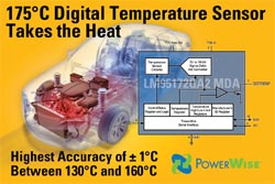 National Semiconductor Corp. (NYSE : NSM) a présenté aujourd’hui un capteur de température numérique permettant de surveiller en permanence la température de systèmes automobiles jusqu’à 175°C, avec une précision de +/- 1°C entre 130°C et 160°C. Ce composant est produit sur une ligne de classe automobile répondant aux spécifications de la norme AEC-Q100 classe 0. National fera la démonstration de ce produit à la conférence Convergence 2008 à Detroit, Michigan, du 20 au 22 octobre, sur le stand 1319.