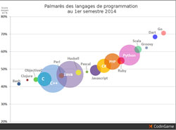 C# monte depuis quelques éditions dans le classement et talonne PHP tant en termes d’utilisateurs que de scores obtenus (avec une moyenne de 52% contre 54% pour PHP).
