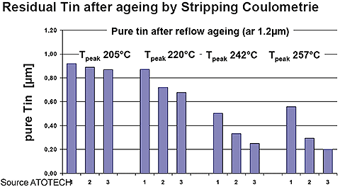 On peut citer une étude sur le finition étain chimique des circuits imprimés. En effet, cette finition semble prendre le devant sur le marché aéronautique nationale par rapport à la finition nickel – or. Sur le procédé d’assemblage étain plomb, la fenêtre du procédé est suffisament robuste pour palier l’inconvénient de cette finition. Le cuivre diffuse dans l’étain chimique et forme une séquence d’intermétalliques qui appauvrit la quantité d’étain pur nécessaire à la mouillabilité et à l’étalement de l’alliage de brasure. Le procédé d’assemblage supporte deux refusions et un passage en vague. Mais pour un procédé sans plomb, le phénomène est accéléré et donc la fenêtre de procédé d’assemblage s’en trouve réduite. Actuellement, il est spécifié une épaisseur minimale de 1,2 µm d’étain chimique après dépôt et voire plus, ce qui pousse le fabricant de circuit imprimé à être en limite de son procédé chimique. Nous alertons les utilisateurs de cette finition à maîtriser la chaîne d’approvisionnement des cartes et les procédés aval tels que l’étuvage et la refusion sans plomb. Il est admis qu’à partir de 0.2 µm d’étain chimique résiduel, la mouillabilité est insuffisante pour assurer un brasage acceptable. Or cette limite est vite arrivée sur un procédé de refusion sans plomb puisque à un premier passage, on mesure une perte de 0.55 µm d’étain chimique comme l’illustre le graphe (diffusion étain chimique.jpg). Dans le projet AMELIE, nous avons regroupé les partenaires industriels (CIRE, SOLECTRON, THALES) afin de valider avec l’industriel ATOTECH, un procédé industriel robuste pour l’utilisation de cette finition dans un procédé sans plomb.