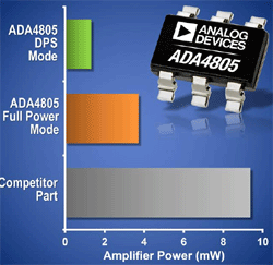 La famille d’amplificateurs ADA4805 avec adaptation dynamique de la consommation assure les meilleures performances du marché en dérive d’offset, vitesse de balayage, niveau de bruit et de distorsion pour les équipements d’acquisition, de données portables