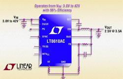 Le redressement synchrone permet d’obtenir un rendement aussi élevé que 96% tandis que le fonctionnement en Burst Mode® maintient le courant de repos inférieur à 2,5µA en mode veille et à vide. La gamme de tensions d’entrée du composant, de 3V à 42V, le rend approprié aux applications de l’automobile, où la régulation doit être assurée dans les scénarios de démarrage à froid /démarrage-arrêt avec des tensions d’entrée minimum aussi basses que 3V, et de surtensions dépassant les 40V en cas de rupture de charge. Ses commutateurs internes 5A peuvent fournir un courant continu de sortie jusqu’à 3,5A, pour des tensions aussi basses que 0,80V.