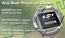 Silicon Laboratories Inc. (NASDAQ : SLAB), leader des circuits mixtes à forte densité de fonctions analogiques et à hautes performances, introduit une nouvelle famille de générateurs et tampons d’horloge qui offre la plus grande souplesse de fréquence de l’industrie. Basée sur la technologie d’avant-garde MultiSynth™ de Silicon Labs, le Si5338 peut synthétiser n’importe quelle fréquence de 0,16 à 350 MHz ainsi qu’une sélection de fréquences allant jusqu’à 700 MHz, sur quatre sorties différentielles, ce qui simplifie spectaculairement les architectures de timing en remplaçant quatre boucles PLL discrètes par un simple circuit intégré. Conforme à la stratégie de Silicon Labs en matière de circuits de timing, visant à fournir les solutions d’horloge et d’oscillateur de plus grande souplesse de fréquence de l’industrie, le Si5338 offre aussi la meilleure performance et la plus forte intégration de sa catégorie tout en raccourcissant les cycles de conception, pour des applications telles que les équipements de communication de prochaine génération, les stations de base sans fil, la radiodiffusion vidéo, le test, la mesure et l’acquisition de données.