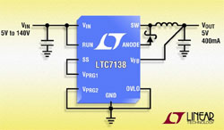 Il fonctionne à partir d’une gamme de tensions d’entrée de 4V à 140V, de ce fait il convient aux applications des télécommunications, de l’industrie, de l’avionique et de l’automobile. Le LTC7138 fonctionne avec une conception à mode hystérésis programmable, afin d’optimiser le rendement sur une large gamme d’intensités de sortie. Il utilise un MOSFET de puissance, interne, de 1,8 Ohm, pour obtenir un fonctionnement robuste et à haut rendement.