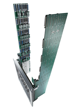 La méthode établie pour la mise en oeuvre de ces solutions de test sur mesure consiste à utiliser plusieurs racks 19 pouces pour chaque (sous-)système important ; les communications RF, le système d’alimentation et la charge utile ont généralement plus d’un rack dédié, et il est même possible d’avoir plusieurs sous-systèmes pour chacun de ces aspects. En outre, il n’est pas rare que les sous-systèmes soient géographiquement distribués, ce qui signifie qu’il faut construire plusieurs racks de test. Tous ces défis peuvent être surmontés, mais le facteur aggravant est la complexité accrue ; le nombre de connexions physiques qui doivent être faites entre l’UUT (unité testée) et l’équipement d’essai ne cesse d’augmenter, et il en va de même pour le nombre de connexions nécessaires dans les racks de test. Physiquement, les constructeurs sont à court d’espace pour mettre en oeuvre le niveau nécessaire d’interconnexions à l’aide d’un câblage classique.