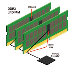 Une LRDIMM DDR3 possède un tampon mémoire situé au centre du module, comme illustré en Figure 2. Comme avec une RDIMM, le tampon mémoire (MB3518) "bufferise" (joue son rôle de tampon) et retransmet les signaux de commande, d’adresse et d’horloge aux DRAM. En outre, la LRDIMM bufferise également le bus de données E/S de la DRAM. En bufferisant les données E/S, jusqu’à quatre charges DRAM au niveau du bus amont peuvent être réduites à une seule sur le bus aval. Un nombre inférieur de charges améliore l’intégrité signal vers le contrôleur mémoire ; cependant, alors que les pistes du bus de données E/S RDIMM DDR3 vont directement du connecteur du module aux charges E/S de la DRAM[1], les pistes de la LRDIMM DDR3 sont routées vers le tampon mémoire situé au centre, augmentant ainsi la longueur des pistes jusqu’à 70 mm en aval et en amont du tampon mémoire (Figure 3).