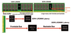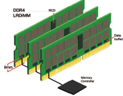 Dans les plateformes serveur DDR3 Gen2[1], les contrôleurs ont commencé à gérer les rangs physiques en amont du tampon de données. Ils ont ainsi pu récupérer les données en mémoire bien plus efficacement, puisque les lectures et les écritures dos à dos sur la même mémoire avaient lieu à vitesse maximum. Ils ont également permis de surmonter plusieurs autres limitations et d’améliorer la vitesse. Ainsi, les plateformes serveur DDR3 Gen2 ont vu leurs performances grimper par rapport aux plateformes DDR3 Gen1, mais ont surtout permis de combler le handicap de bande passante par rapport aux solutions RDIMM. Le seul handicap résiduel des plateformes DDR3, était l’existence de latences dues aux composants et aux longueurs de piste, évoquées plus haut.
