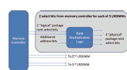 Depuis l’introduction des premières LRDIMM DDR3, les contrôleurs mémoire ont progressé en intelligence pour tirer meilleur parti des capacités mémoires étendues des LRDIMM. Plus récemment, une nouvelle fonctionnalité appelée "multiplication de rang" ("rank multiplication" en anglais) a permis de réduire la latence et d’améliorer la bande passante. La multiplication de rang est illustrée en Figure 7.