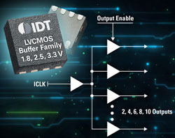 Ces nouveaux buffers existent en versions à 2, 4, 6, 8 ou 10 sorties LVCMOS, et supportent des tensions d’alimentation et de sortie de 1.8V, 2.5V ou 3.3V. Ils offrent un faible "skew" (écart entre les sorties) en sortie (50 ps) et une consommation intrinsèque de seulement 14 mA. Tous les dispositifs de cette nouvelle famille de buffers fonctionnent dans une plage de températures allant de -40°C à +105°C, ce qui leur permet aussi de répondre aux besoins des applications automobiles d’info-divertissement.